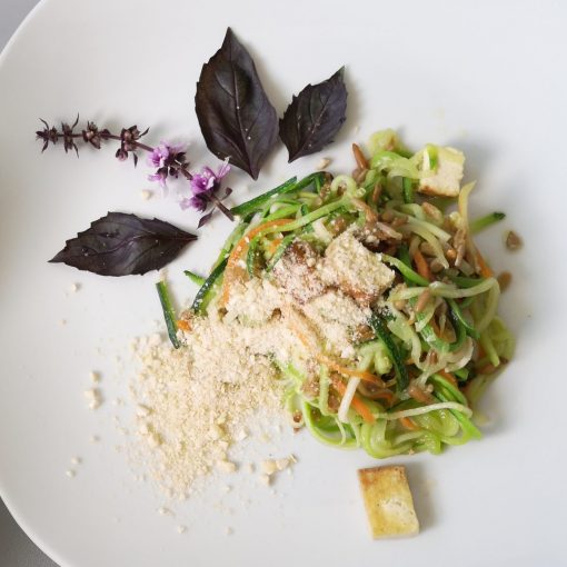 Po 20 minutah peke, smo ga prekrili z po dolžini narezanim korenjem, bučke in melancane pa smo zložili na višjo mrežico. Tako je vroč zrak lahko lepo enakomerno segreval vso zelenjavo. Bučke in melancane smo pred peko marinirali v olivnem olju s soljo. Vse skupaj se je peklo približno eno uro, zato smo se v tem času lotili priprave solatnega preliva in ribanja kumar na lističe.